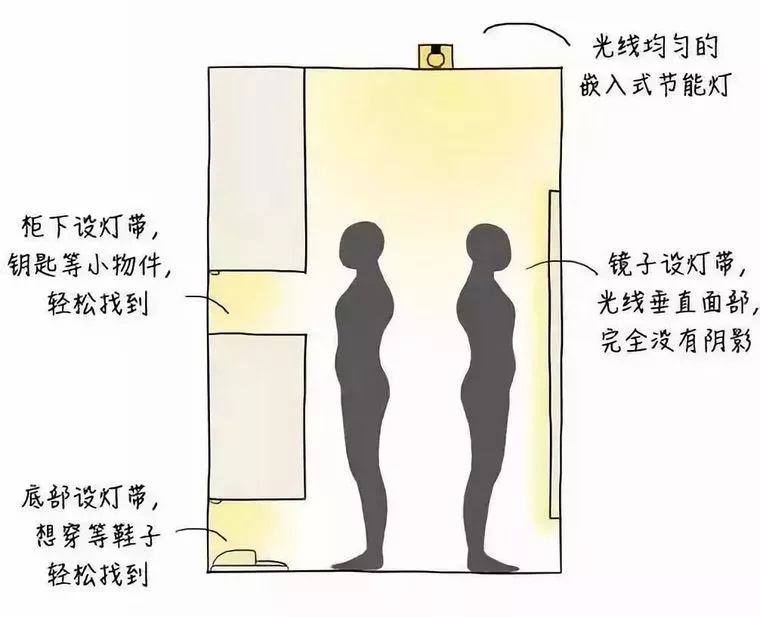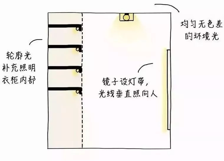 衣柜的局部照明,是為了方便使用者在打開衣柜時,能夠看清衣柜內部的情況。衣帽間需要均勻、無色差的環境燈,鏡子兩側設置燈帶,衣柜和層架應有補充照明。最好選用發熱較少的LED產品▼