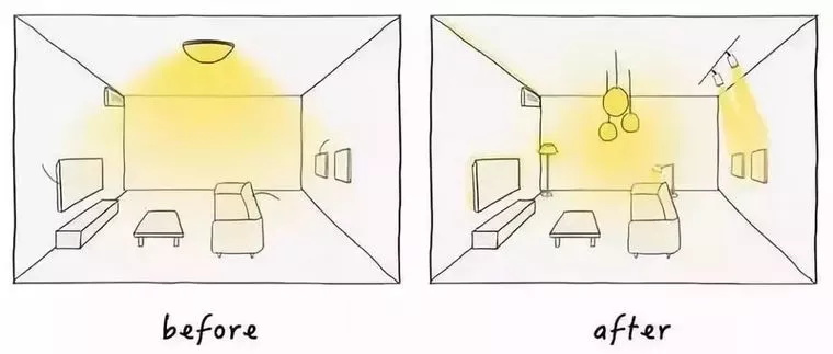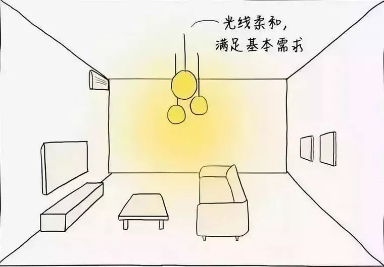 一般人都會想,房間只要夠亮就行了,于是就出現了下面這種“一盞熒光燈or吸頂燈走天下”的死板場景 ↓