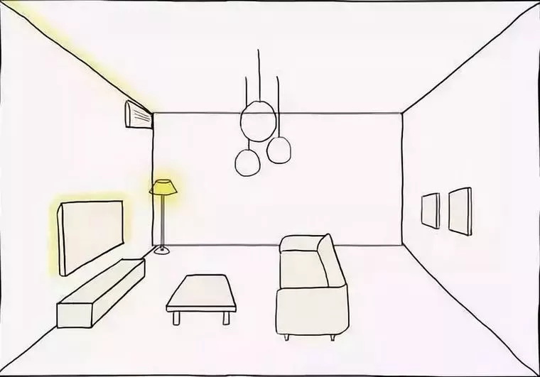 在電視墻的區域,可以增加光線更柔和、更均勻的間接照明燈飾。比如燈帶或者一些小臺燈。這樣可以使人更放松。電視上方可以裝燈槽,為整個空間提供漫反射光線,減少電視畫面與背后的亮差,緩解視覺疲勞▼