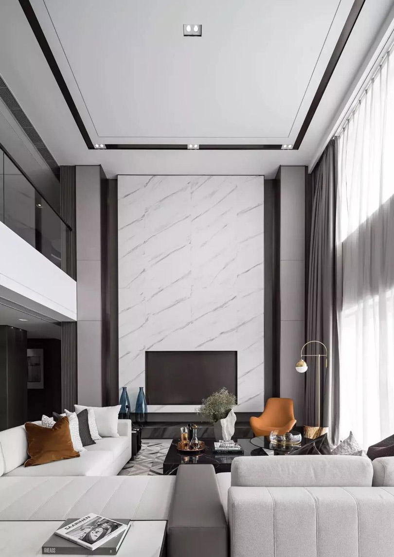 挑高空間設(shè)計(jì)吊頂,一般需要搭配燈飾以及單層/多層的裝飾線條進(jìn)行修飾。