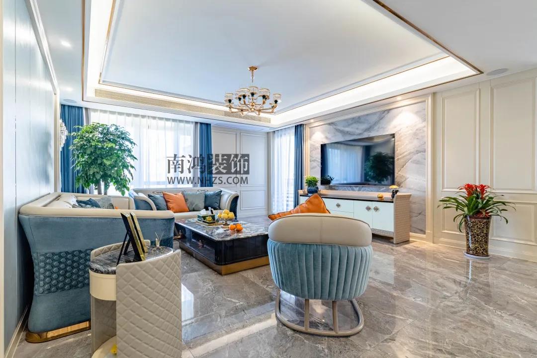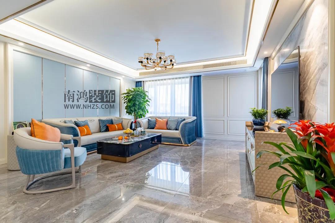 戶 型 圖 設(shè)計說明: 1、進(jìn)門處拆除左墻,使父親房和客衛(wèi)干區(qū)面積增大,并改變客衛(wèi)進(jìn)門位置,使得餐廳更加完整; 2、過道上的走入式衣帽間改成了兩個背靠背的柜子,不僅使房間增大,還多了一個書柜的空間; 3、母親房原本的房門直對過道,后更改了位置; 4、主臥改了衣帽間的朝向和主衛(wèi)的墻,在保證空間的情況下滿足了業(yè)主儲物需求。 客 廳 客廳的地面選用深灰色拋釉磚,大理石材質(zhì)的電視背景墻與之呼應(yīng)。大面積藍(lán)色系的運(yùn)用,使客廳空間透出清爽自然的氣息,背景墻、吊頂和家具中都加入了金色元素,透出優(yōu)雅輕奢的味道。 沙發(fā)結(jié)合了皮革、布藝和絨面,溫暖舒適。桔色的抱枕作為跳色,為這方空間注入了活力和趣味,角落里的大盆綠植增添生氣。 客廳望向玄關(guān)視角。通透的空間感與視覺感令人無比舒適~ 餐 廳 餐廳延續(xù)了客廳的硬裝風(fēng)格,與客廳之間毫無阻礙,動線流暢,開敞的空間還能帶給居住者更多有關(guān)美食的想象。 餐廳背景僅用一幅簡約藝術(shù)畫裝飾,兩側(cè)設(shè)計入墻式餐邊柜,實用且大方,并利用后陽臺的位置開辟了一個休閑吧臺的空間。 明黃的花色在這個純凈的視界中散發(fā)出鮮明而絢麗的審美意涵,讓屋主在芳香中品嘗人生百味~ 主 臥 主臥背景墻風(fēng)格與客廳相似,又借暖色的床品顯現(xiàn)出空間個性,淺色木地板顯得溫潤而舒適。房間中還專門擺放了床尾凳,從細(xì)節(jié)上進(jìn)一步提升空間品質(zhì)。 兒 童 房 兒童房背景墻選用淺藍(lán)色墻漆裝飾,搭配多彩的窗簾和純白的高背床,簡約中勾勒出活力色彩。 兒童房進(jìn)門一側(cè)多放了一個書柜,結(jié)合另一側(cè)的學(xué)習(xí)區(qū),充分滿足孩子讀書時的日常需求。 衛(wèi) 生 間 次衛(wèi)一,做了干濕分離,暖灰色的墻磚與地磚呼應(yīng),視感舒服,高級灰的浴室柜挑空設(shè)計并點綴上金屬細(xì)節(jié),時尚而前衛(wèi)。 次衛(wèi)二,采光充足,光線明亮,深藍(lán)的衛(wèi)浴柜搭配金色拉手,顏值滿分。 | 地址:水景城豪苑 | 面積:250㎡ | 風(fēng)格:輕奢 | 設(shè)計施工:浙江南鴻裝飾