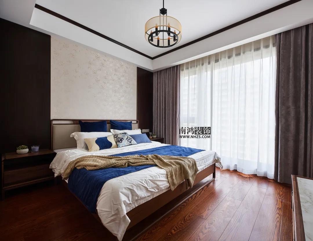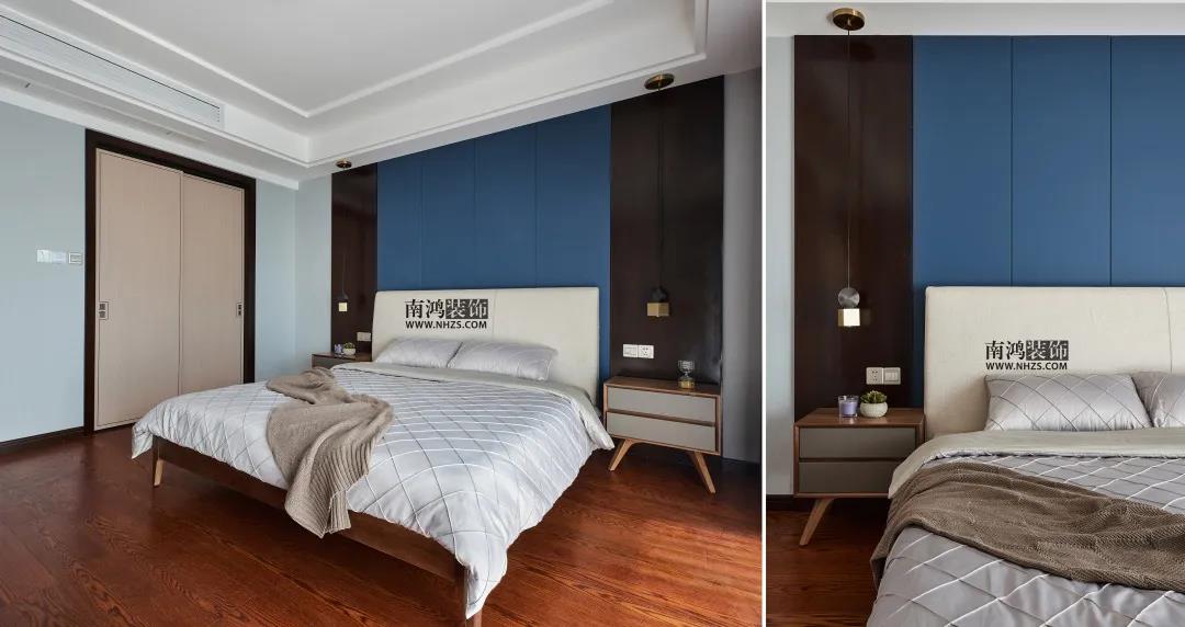 業主大兒子的房間,應居住者需求,淡化了中式元素而更偏向現代風格。雙層折邊吊頂簡潔大氣,床頭背景墻選用藍色硬包結合木飾面,床頭柜上方設計了金屬色吊燈點綴空間。