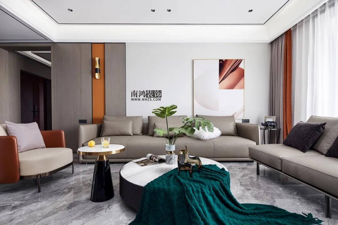 客廳以白灰色為基調展現低調輕奢氛圍感,輔以鮮活的愛馬仕橙點綴,明朗干凈之余更顯前衛氣息。