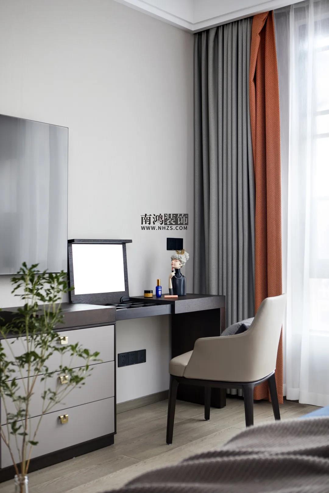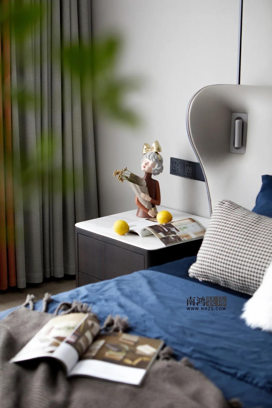 低調至簡的灰色系臥房中,點綴靜謐的深藍與活力的橙色,優雅格調呼之欲出。床頭背景墻做了前后關系處理并暗藏燈帶,增加視覺上的層次感。