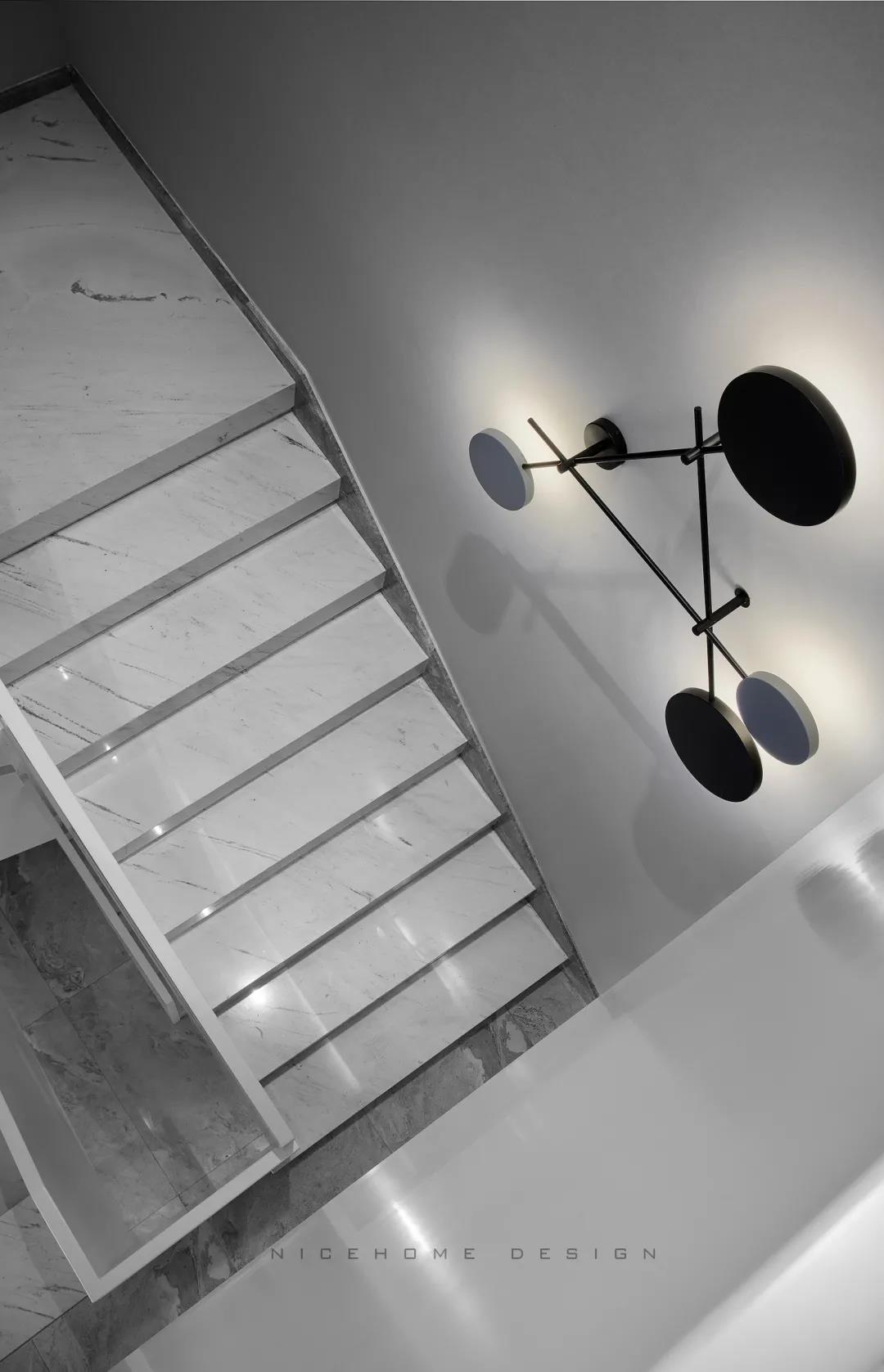 一層原結(jié)構(gòu)樓梯位置不合理,處于入戶正對(duì)口,現(xiàn)移動(dòng)至西側(cè)以規(guī)避缺陷。客廳主沙發(fā)后做一面凌空隔斷墻,增加視覺(jué)層次與進(jìn)門(mén)后的儀式感。