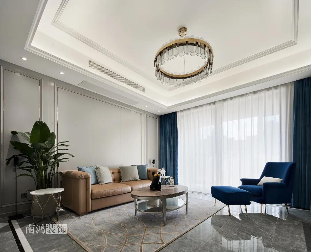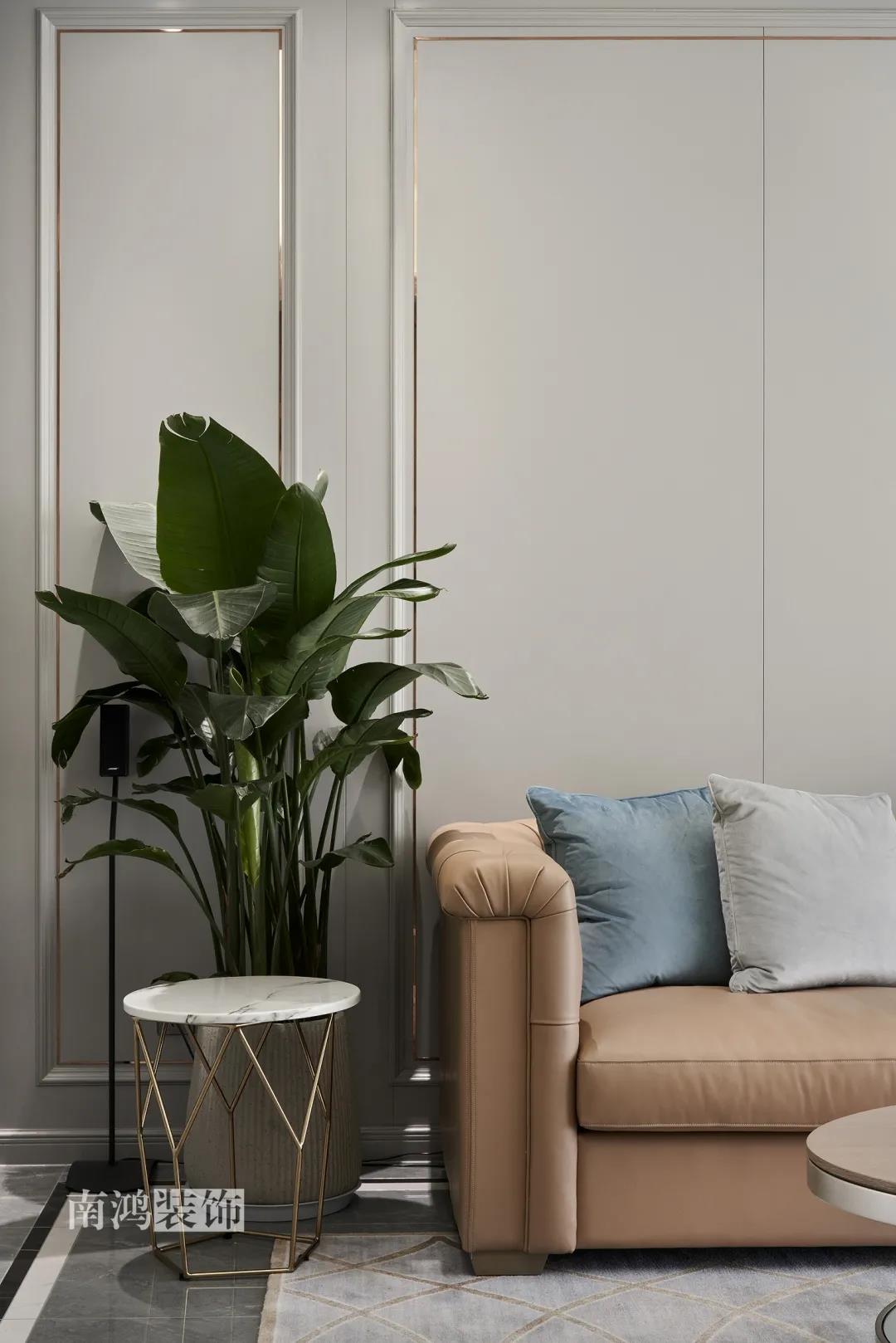 沙發背景墻是全屋統一的木做護墻添加入金色不銹鋼線條,淺棕色的主沙發平衡空間情緒,溫和視線。