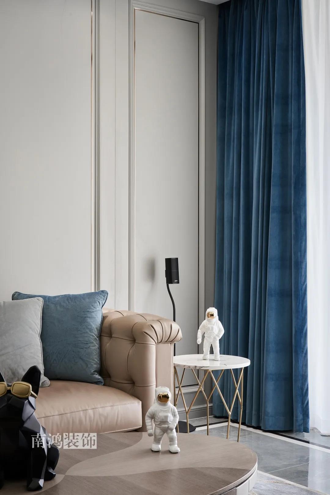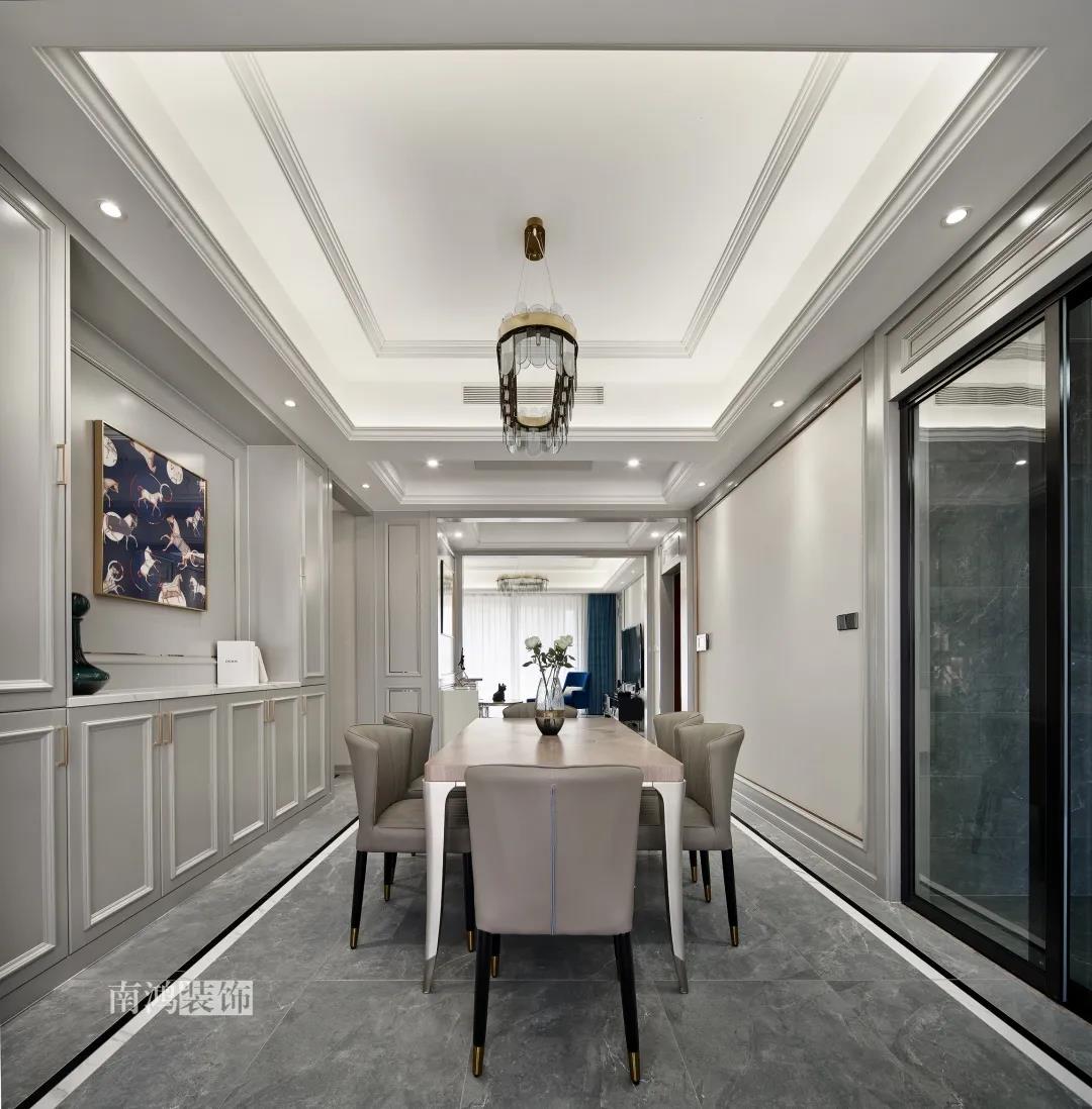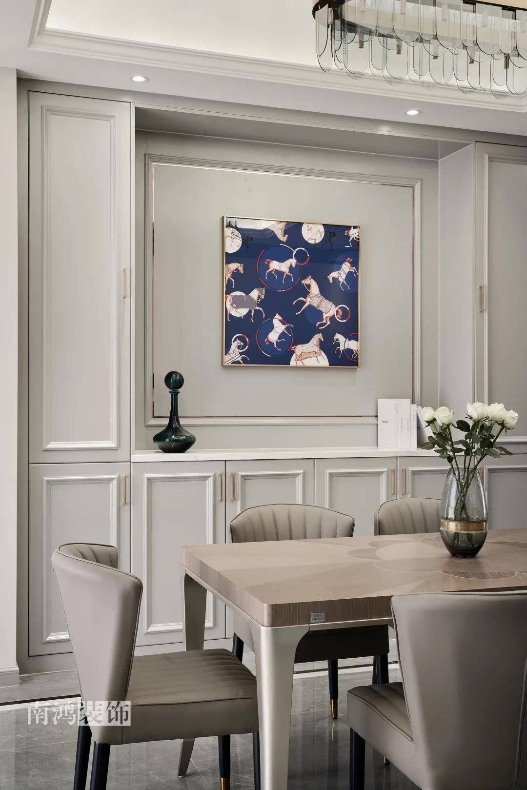 本案在硬裝上采用全屋護墻板,組合上不銹鋼線條,呈現非常有質感有層次的輕奢細節。張弛有度的設計處理,強化了對空間框架和秩序的知覺,為屋主營造出頗具儀式感的生活氛圍。