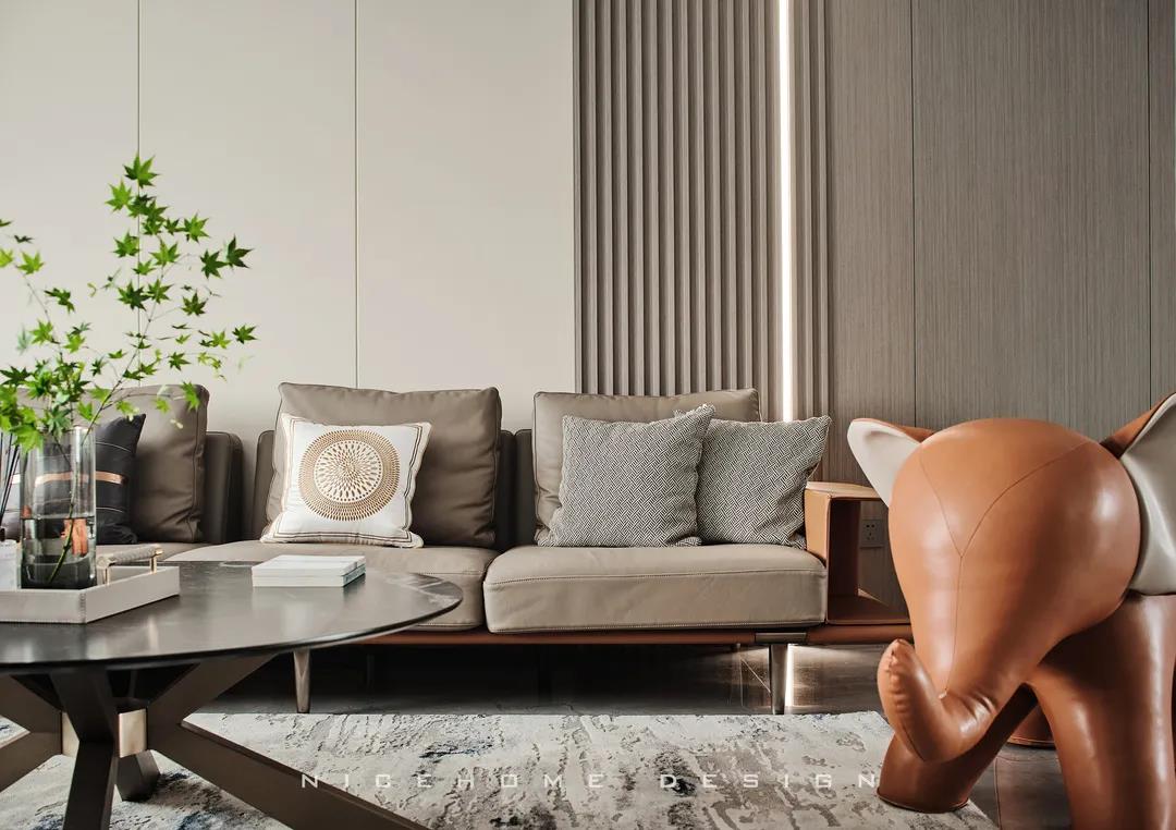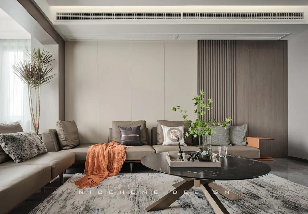公共區域整體采用暖咖和黑、白色調,溫和親切又帶著現代感的利落灑脫,木格柵增強視覺效果,軟裝上則重點用橙色點綴,烘托溫馨氣氛與活力感受。