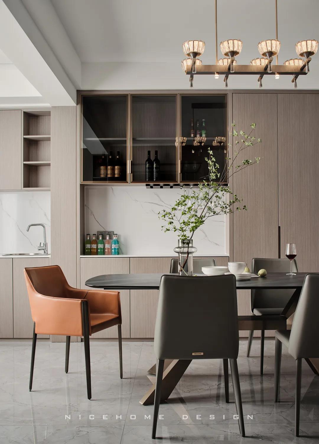 整排餐邊柜兼做酒柜,玻璃柜內藏酒,儲物柜里存放食品,實用性與美觀度都是一流。窗邊做了小水吧,延續廚房的功能,餐前餐后的手部清潔也更方便。