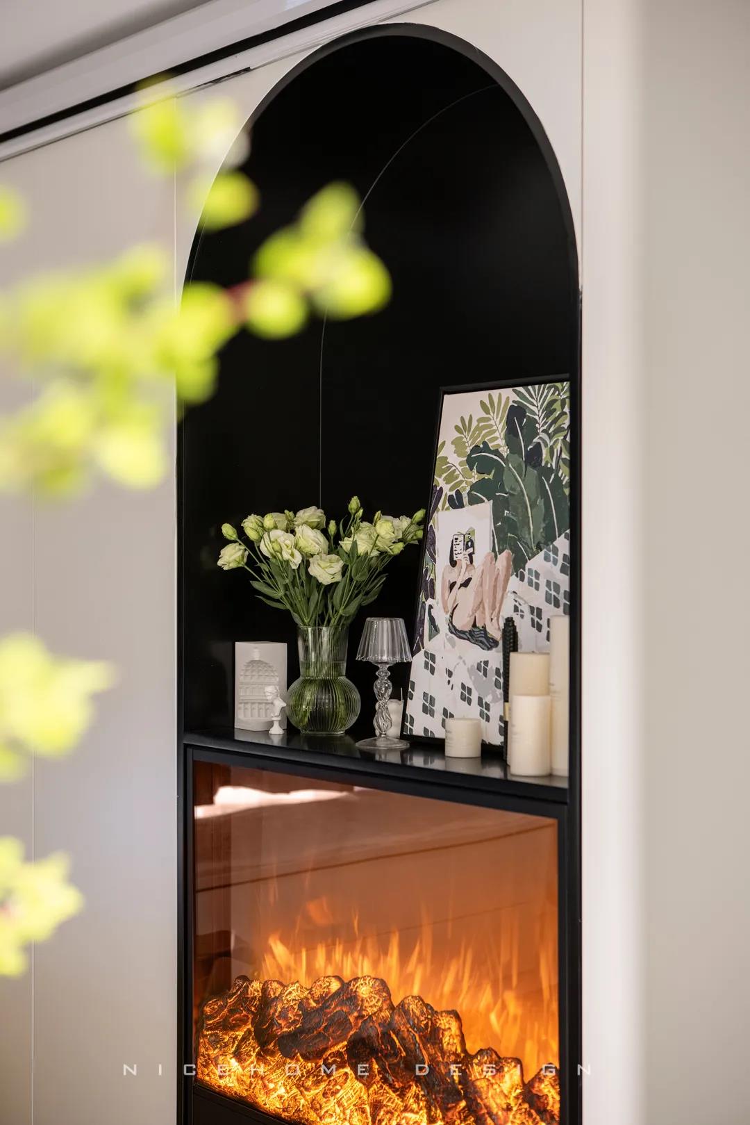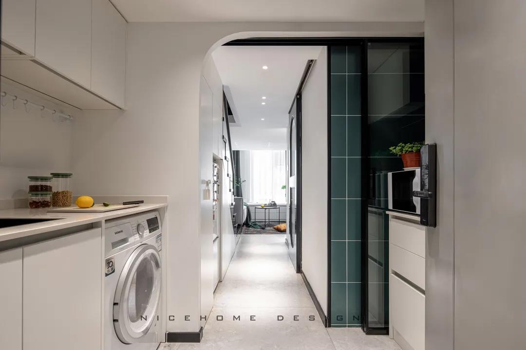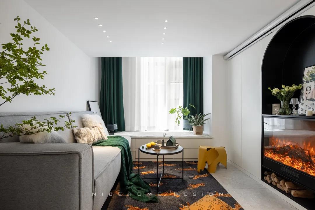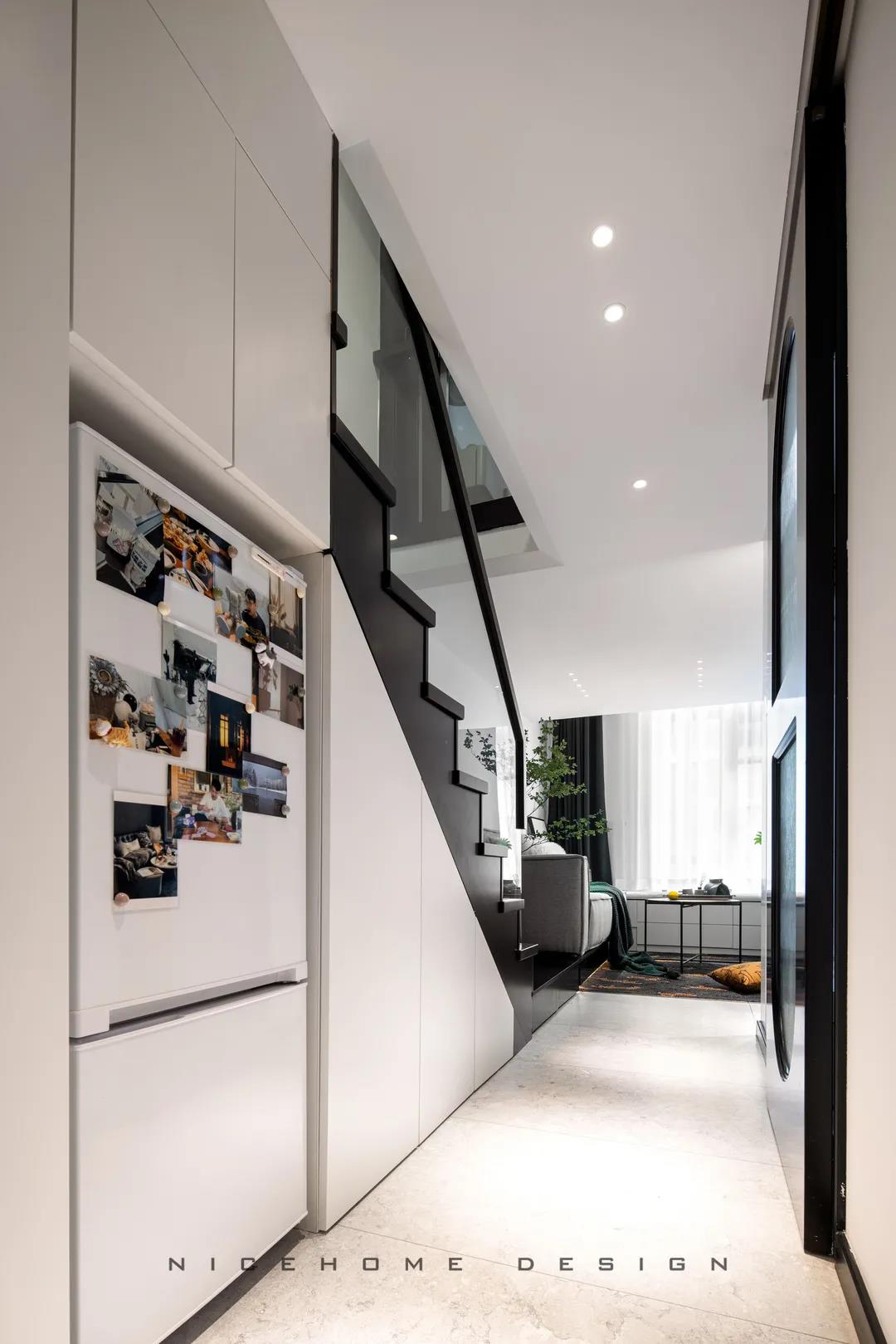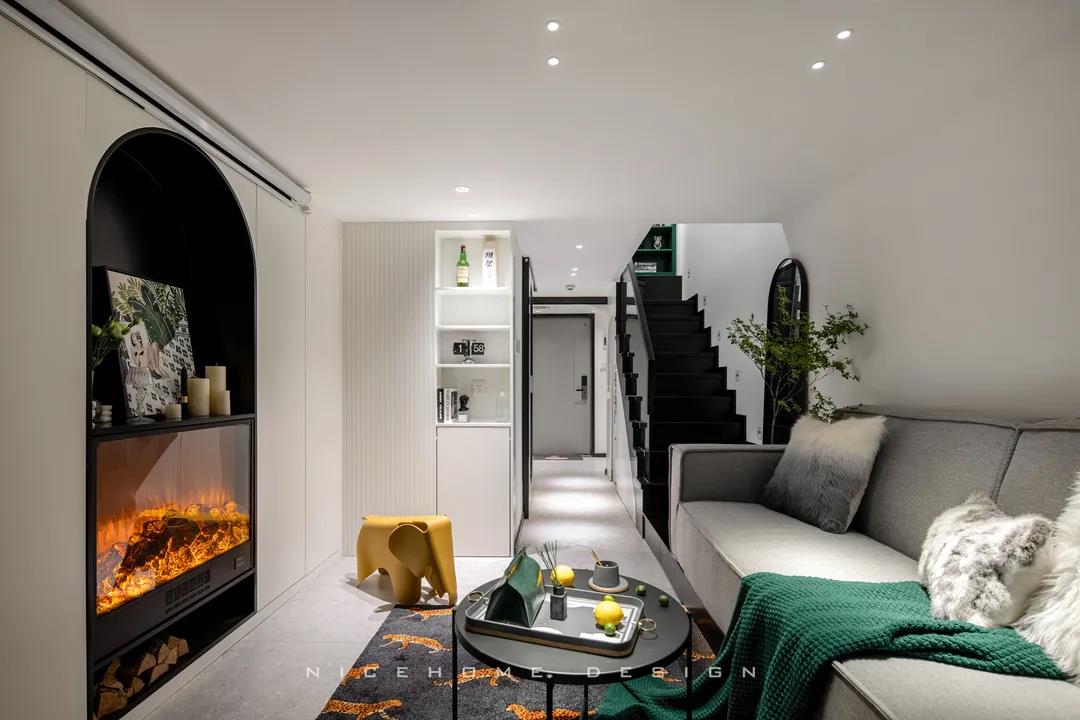 ? 案例信息 地址:時光里 戶型:Loft 面積:47.5㎡ 風格:現代都市 設計施工:浙江南鴻裝飾 ? 戶型分析 不到50方的屋子,還是設計出了三房的功能,以滿足業主的加班需求及父母偶爾小住的客臥需求。底樓只有一扇窗戶沒有陽臺,所以設計師在臨窗位置做了挑空,最大化保留居室采光。 進門即是玄關與廚房的位置,小小的開放式廚房供兩個人的日常用餐還是很方便的。 小戶型因為面積有限,所以角角落落的地方都不能浪費。白色的收納柜包容所有雜物,體積較大的冰箱、洗衣機也都做了嵌入,過道的門洞則設計成半拱形,一系列小細節便能讓我們感知到主人對家的用心。 Loft公寓戶型,典型的只有一扇窗沒有陽臺,設計師便在此做了一個挑空,讓采光與視野都能盡量打開,避免局促。 公共區域比較狹小,又得兼顧到收納,便以柜體+壁爐的形式做背景,投影幕布取代電視機,讓美學與實用功能盡可能達到平衡。 墨綠色的點綴優雅不失活力,壁爐內跳動的火焰帶來家的溫度。小象形狀的椅子、壁面的線條切割、清新的綠植花卉,還有風格統一的沙發茶幾和地毯,都是室內的點睛之筆。 那些對生活充滿熱情的人,內心便是詩,外現出來,慢慢具象到了家的模樣之中。 小角落擺放一面弧形鏡,既是元素上的呼應,也巧妙放大了空間。 啞黑色的扶手與階梯,充分展現都市生活的現代格調。 由樓梯望向客廳的精致小景,窺見家的脈脈柔情~ 臥室背景留白,低飽和色彩創造舒眠環境,千鳥格紋自帶經典美感,光源都被設置得“小心翼翼”,仿佛不忍打擾這里的寧靜。 床頭深沉的墨綠色,與床品的淺綠形成了具有層次感的優雅格調,精心挑選的機械金屬燈與整體氛圍形成反差,增添了一絲趣味感。 衛生間選擇灰色主調,墻面鋪貼灰白色結合的孔雀羽瓷磚豐富視覺效果,壁掛式馬桶省空間還便于清潔。