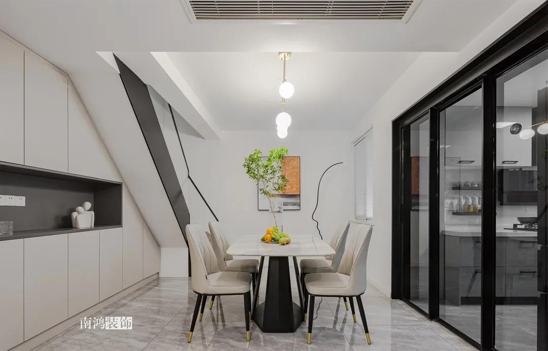 黑白灰三色搭配的餐廳空間,點綴的金屬材質點亮活力。開敞明亮的用餐環境,兩側都留有足夠大的通道距離,應對日常的社交聚餐可以說毫無壓力。