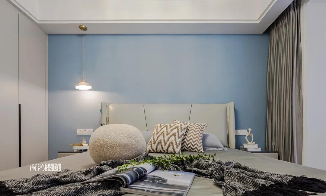 主臥包入陽臺打造為休閑區,床頭背景清新的淺藍色與床品的灰色、單椅的橙色形成了具有層次感的溫馨格調。