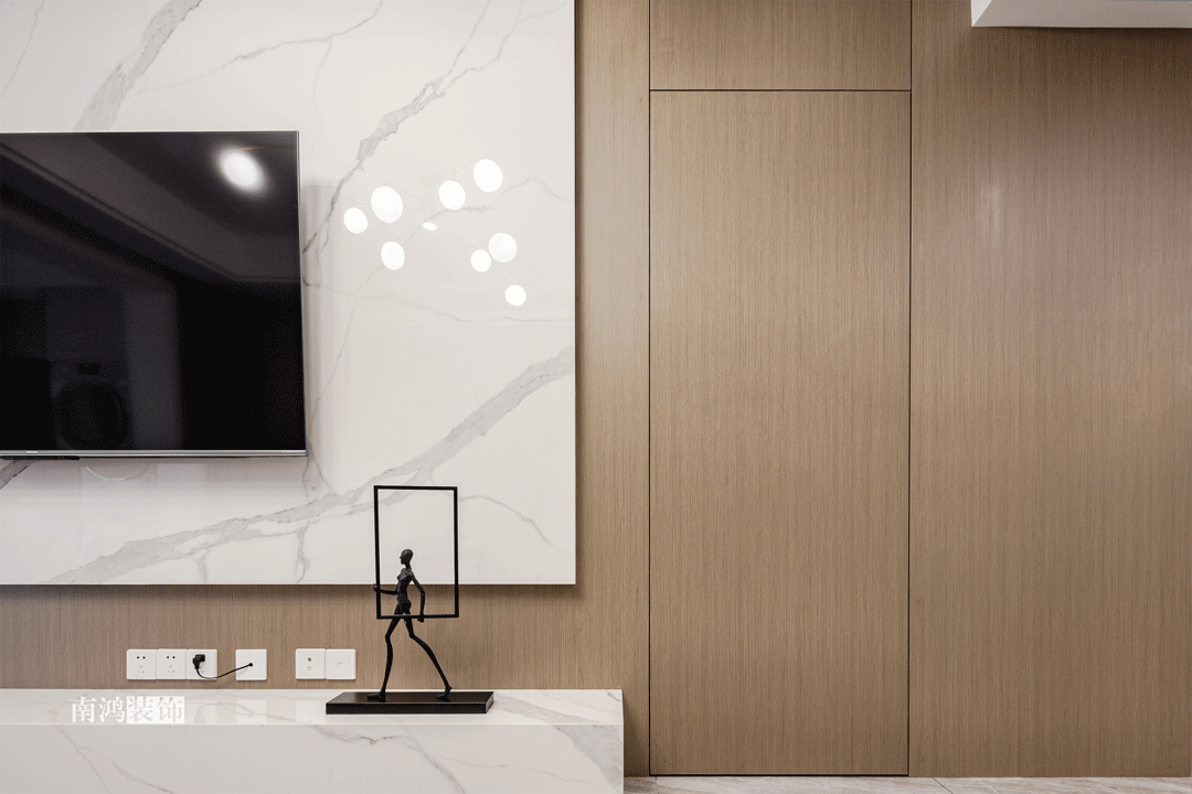 美觀大方的客廳空間,左右兩側維系著剛剛好的距離,溫和的底色在視覺上減輕了壓迫感。大理石與木飾面結合的電視背景,搭配硬包,皮藝沙發和單椅,顯出輕奢意味。